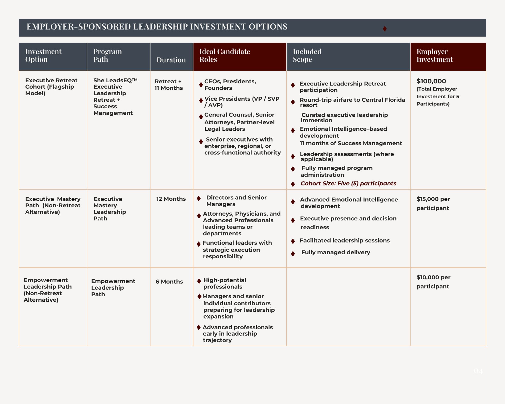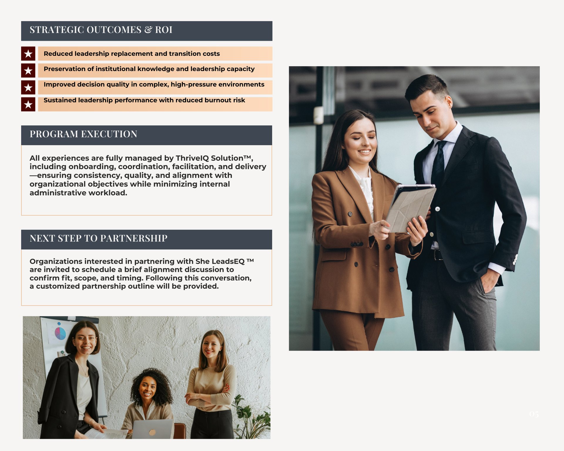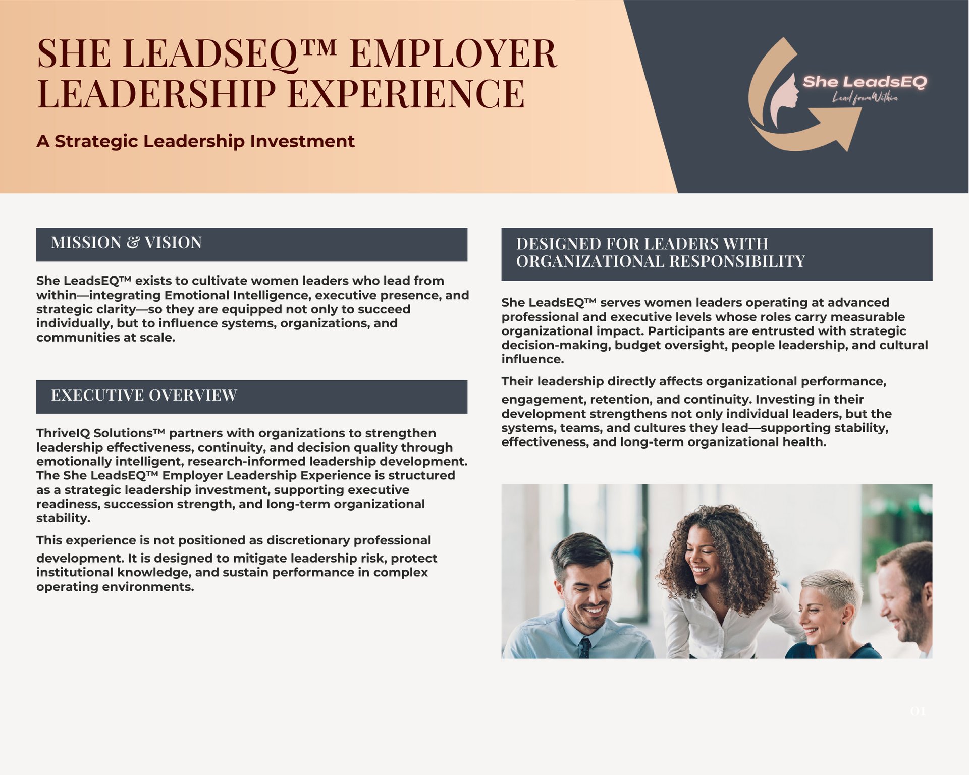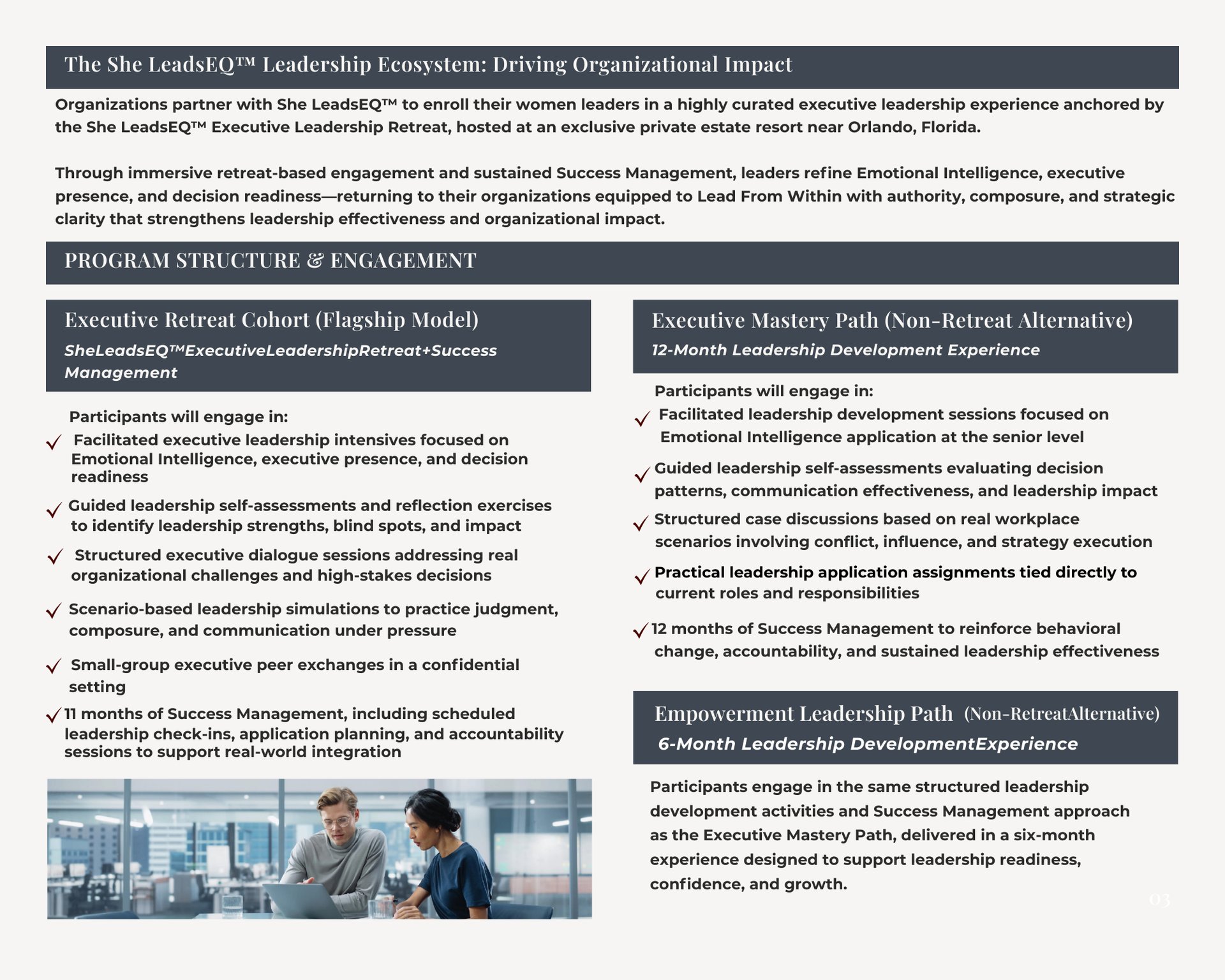 She LeadsEQ™ partners with organizations to design and deliver a fully customized leadership experience for their women leaders, using the She LeadsEQ™ framework as the foundation. Employers select the retreat date, participant cohort size, and leadership pathway, while She LeadsEQ™ manages program design, facilitation, and delivery.